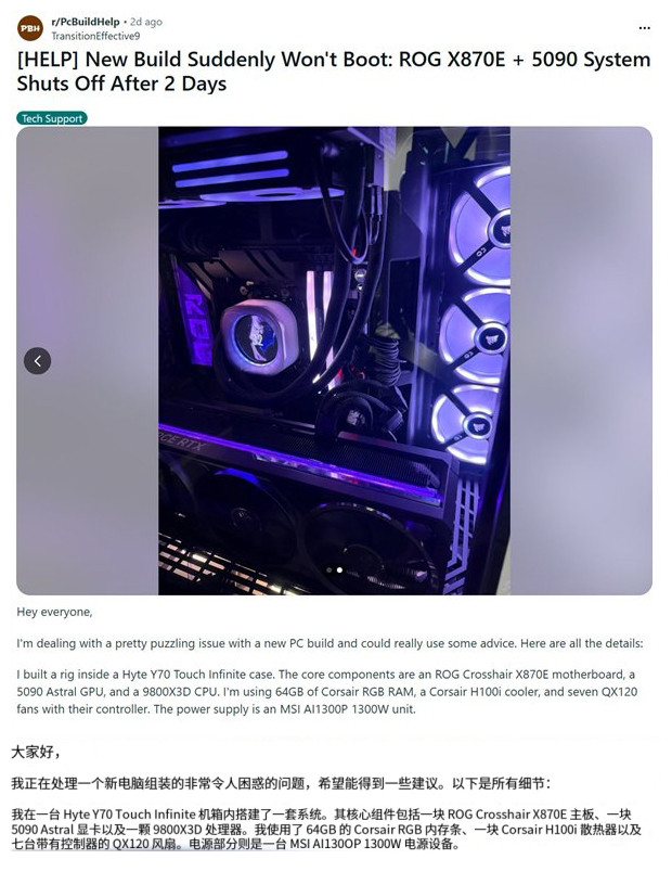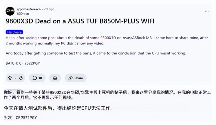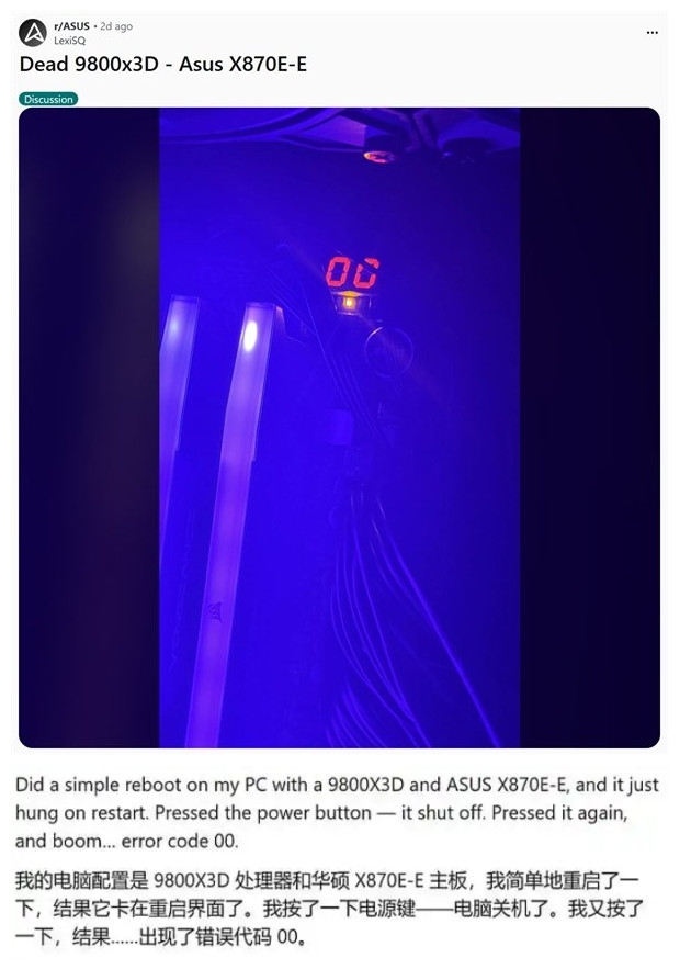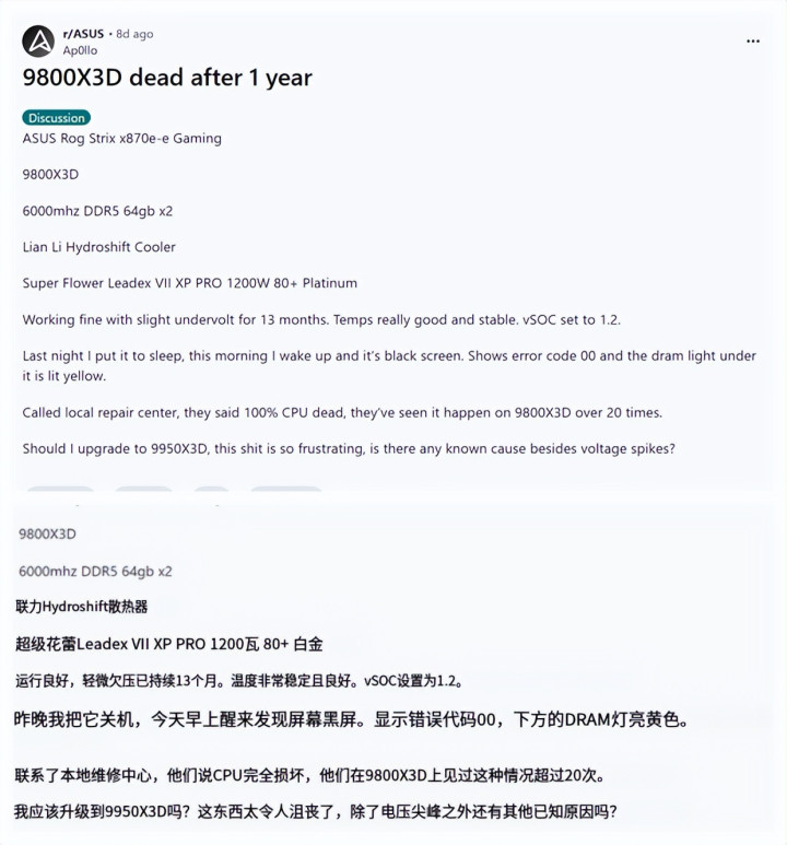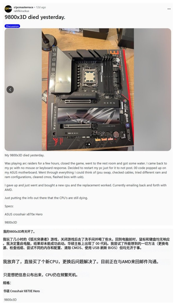 根据报道来看,在短短一天内,海外科技社区Reddit上便集中出现三起华硕主板用户报告9800X3D有问题的案例。其中两起发生于ROG Crosshair X870 Hero与ROG Strix X870E-E Gaming等高端旗舰主板,另一起则首次波及中端市场的ASUS TUF B850M-Plus WiFi主板。这意味着,故障风险或已不局限于特定品牌或高端型号,而是呈现出跨产品线、多平台蔓延的趋势。