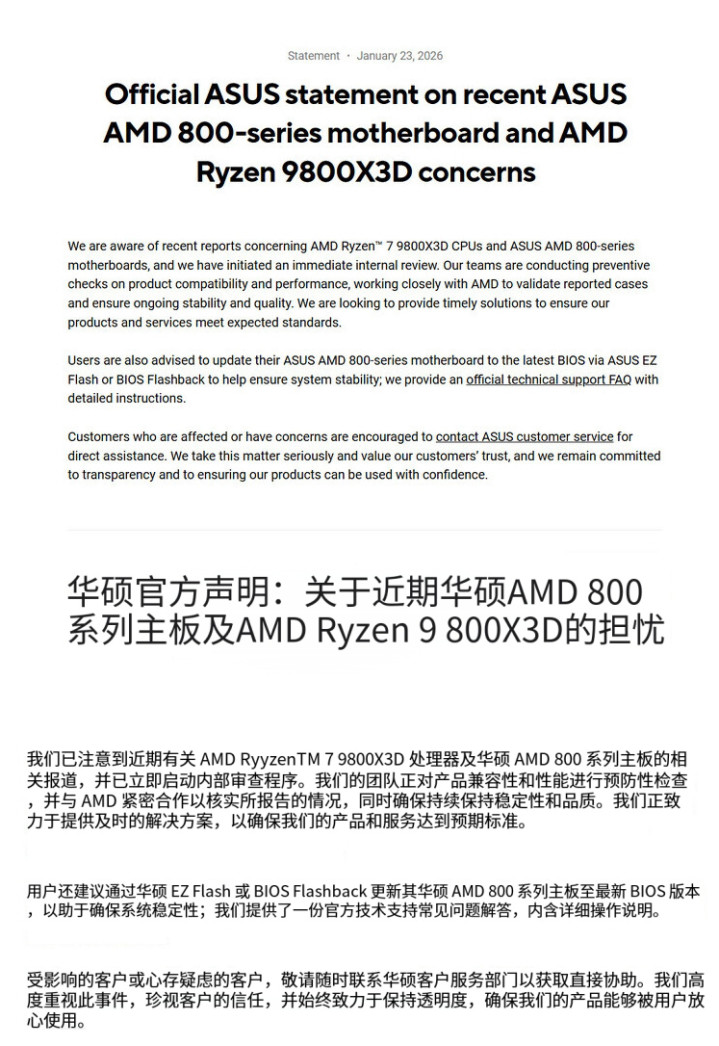 目前华硕已发布官方声明,承认正与部分用户联系并展开联合调查,同时建议所有搭载9800X3D的用户尽快将主板BIOS升级至最新版本,以规避潜在风险。然而这一建议式回应难掩行业对系统性缺陷的深层忧虑。事实上自X3D系列首发以来,相关烧毁报告已断续出现数月,但AMD与主板厂商初期多将问题归因于内存兼容性或用户超频操作,未能及时发布统一警示与强制性修复方案,响应速度被广泛批评为迟缓且被动。
